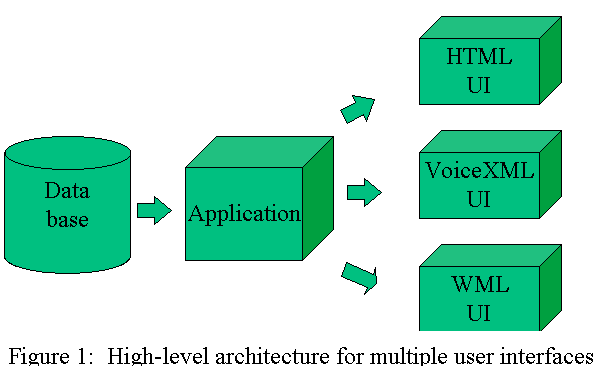 How can developers create a single application to support these various devices? By separating the application implementation from each user interface implementation. Figure 1 illustrates an architecture to support multiple devices with differing modes of input/output. This architecture consists of: