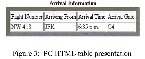 For this example, the sequence of control presentation is elementary for the PC and WAP users. A single table is presented to the PC user and a single card is presented to the WAP user. Verbal interfaces require that information be sequential. Designers determine to present the flight number, departure airport, arrival time, and the arrival gate number in a VoiceXML prompt. The multimodal user interface displays a moving dotted line in addition to seeing a visual message in a box while hearing a verbal message.